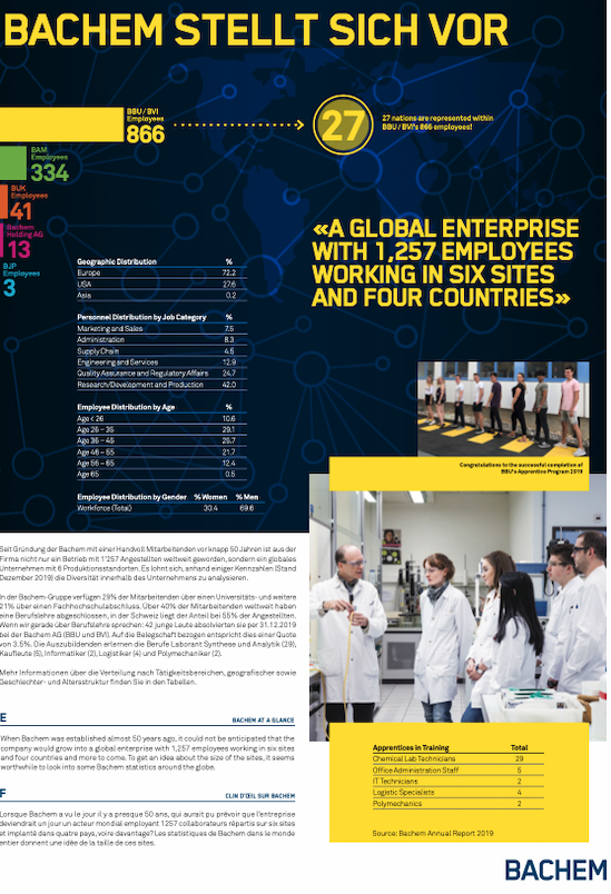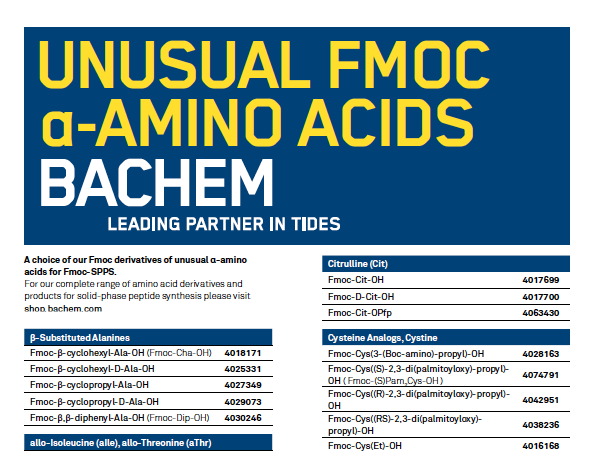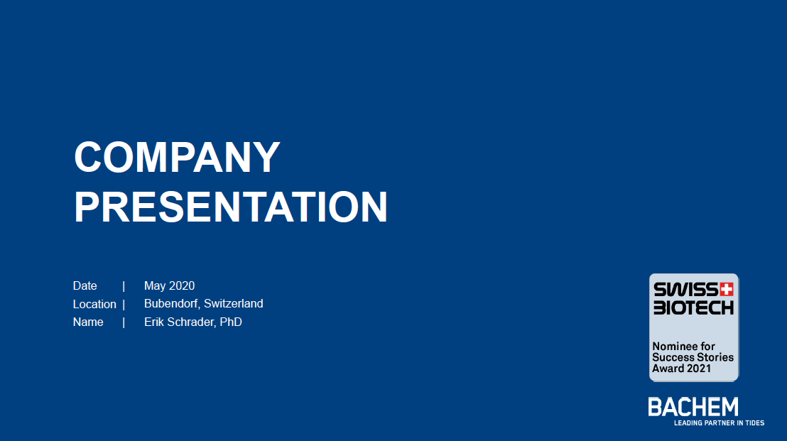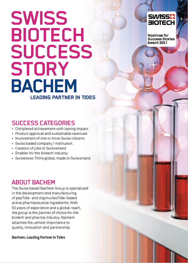 The Swiss based Bachem Group is a public, innovation-driven company specializing in the development and manufacturing of pepTides and oligonucleoTides. As a full service provider Bachem offers products for clinical development and commercial applications as well as a comprehensive catalog and exclusive custom synthesis. With 50 years of experience and subsidiaries in Switzerland, the United States, the United Kingdom and Japan, Bachem is the partner of choice for the biotech and pharma industry worldwide. |
